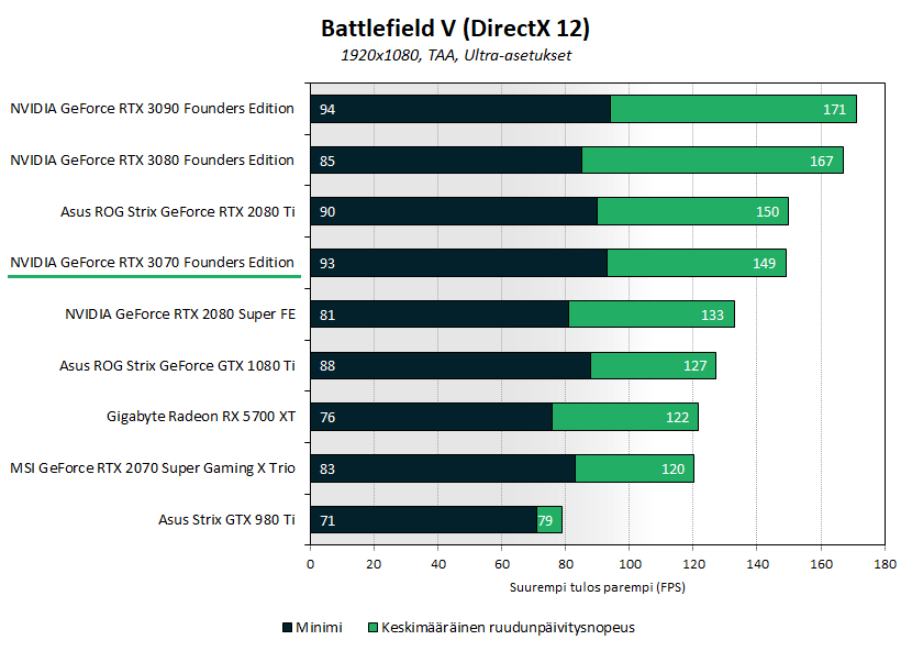 Battlefield V:ssä 1440p-resoluutiolla Asuksen Strix RTX 2080 Ti oli 7 % ja GeForce RTX 3080 puolestaan 29 % suorituskykyisempi kuin RTX 3070.