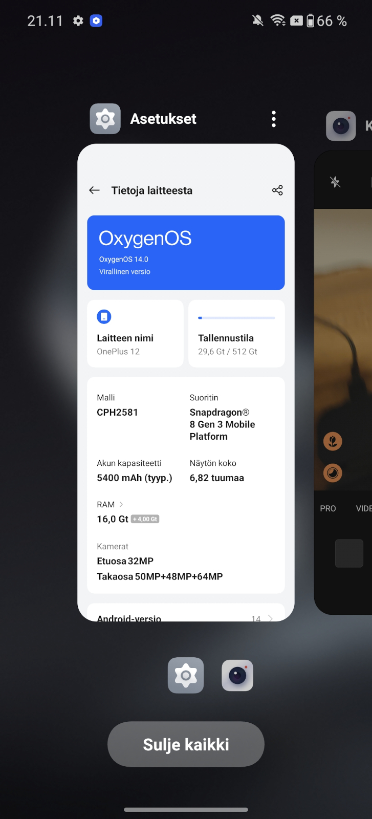 Kaikille vakiona rajoitettu prosessoriteho ei tokikaan tule näkymään, enkä itsekään sitä testijaksolla peruskäytössä huomannut. Siitä huolimatta, kun puhelimella on hintaa jo lähes touhutonni, voisi sen odottaa tarjoavan jo suoraan paketista parasta mahdollista suorituskykyä. Rajoitus on siinäkin mielessä erikoinen, ettei se vaikuttaisi parantavan akunkestoakaan, sillä suuren 5400 mAh:n akkunsa kanssa OnePlus 12 jaksoi hyvät, muttei kuitenkaan poikkeukselliset kaksi päivää yhdellä latauksella.