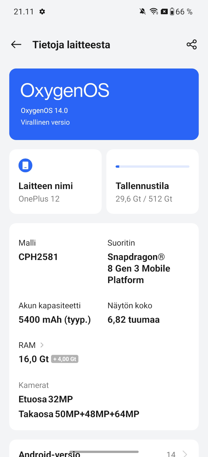 - Android 14, OxygenOS 14