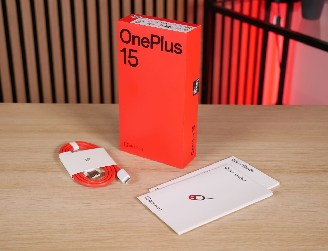 OnePlus 15:n kirkkaanpunainen myyntipakkaus on kooltaan ja ulkoasultaan tuttu edeltäjämallista – pieninä muutoksina kannessa lukee nyt numeron ohella myös OnePlus ja Hasselblad-logo on poistettu kannesta yhteistyön päättymisen myötä.