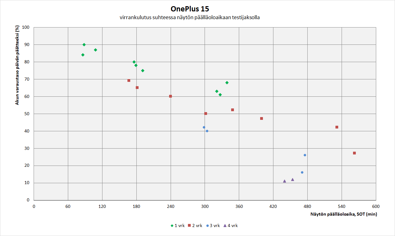 Neljän päivän ylitys onnistui testijaksolla hieman kevyemmällä käytöllä pariin otteeseen ja neljännenkin päivän iltana akkuun jäi vielä runsaan 10 %:n varaustaso. Näytön päälläoloajaksi kertyi näiden neljän päivän jaksojen aikana lähes identtiset noin 7,5 tuntia, eli vajaa pari tuntia päivää kohden.