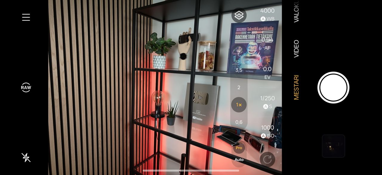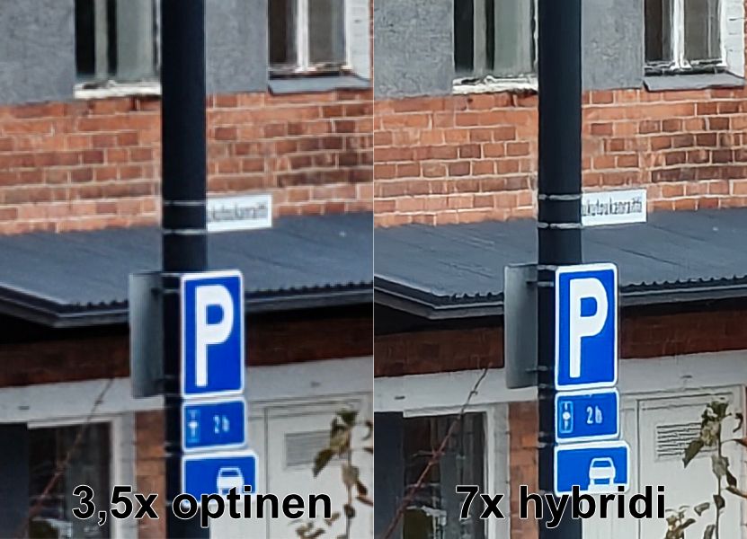 Kuvausnäkymässä on oma painikkeensa 7x-tilalle, joka on käytännössä sensoritason rajaus 50 megapikselin telekamerasta. Se tarjoaa havaittavasti enemmän yksityiskohtia telekameran natiivilla 3,5x-tilalla otettuihin kuviin nähden, mutta jälki on pikselitasolla hieman prosessoidun näköistä. Pienin varauksin 7x-tila on kokonaisuudessaan käyttökelpoinen lisä, kunhan hyväksyy hieman epäluonnollisen prosessointijäljen yksityiskohdissa.