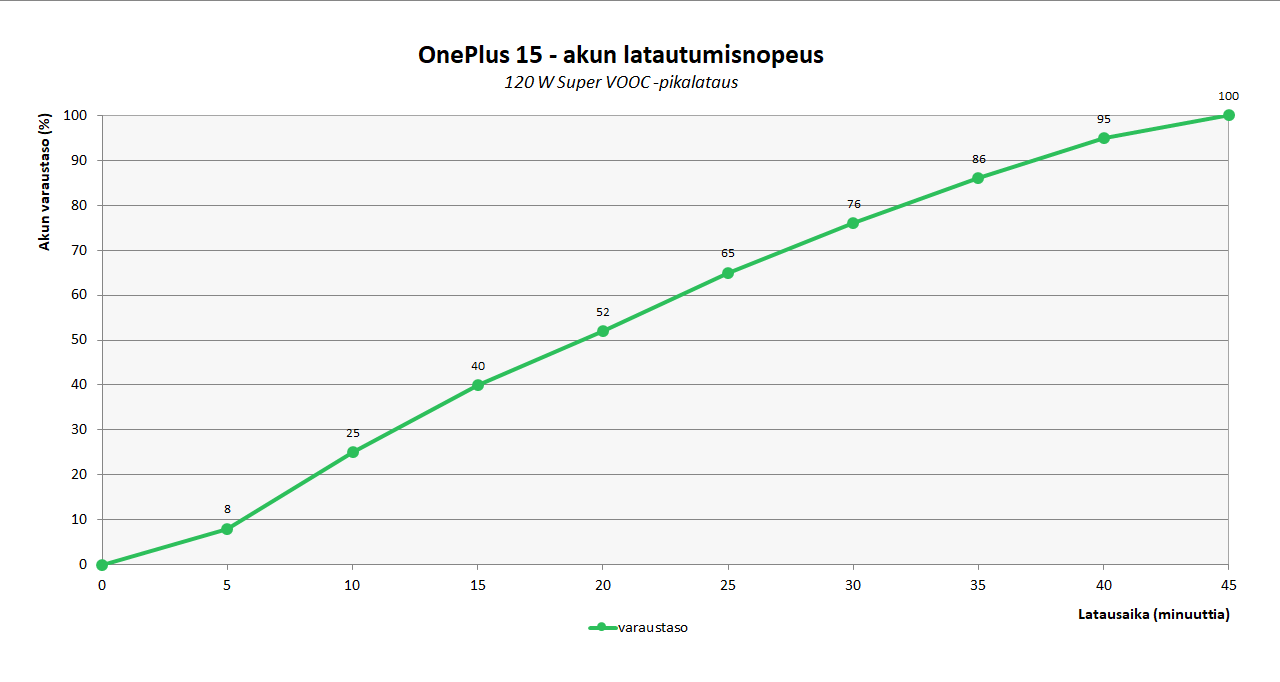 Valmistaja lupaa akun täyttyvän tyhjästä 39 minuutissa ja testiemme mukaan lupaus pitää suunnilleen paikkansa, sillä OnePlussan 120 watin SuperVOOC-laturilla mittasimme ajaksi vajaat 45 minuuttia. Kellottamassamme ajassa on hyvä huomioida, että akku oli aloittaessa täysin tyhjä ja puhelin suostui käynnistymään vasta noin 3 minuutin lataamisen jälkeen. Tämä näkyy kuvaajassa alun ”hidasteluna”.