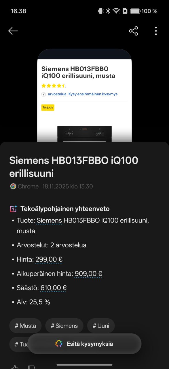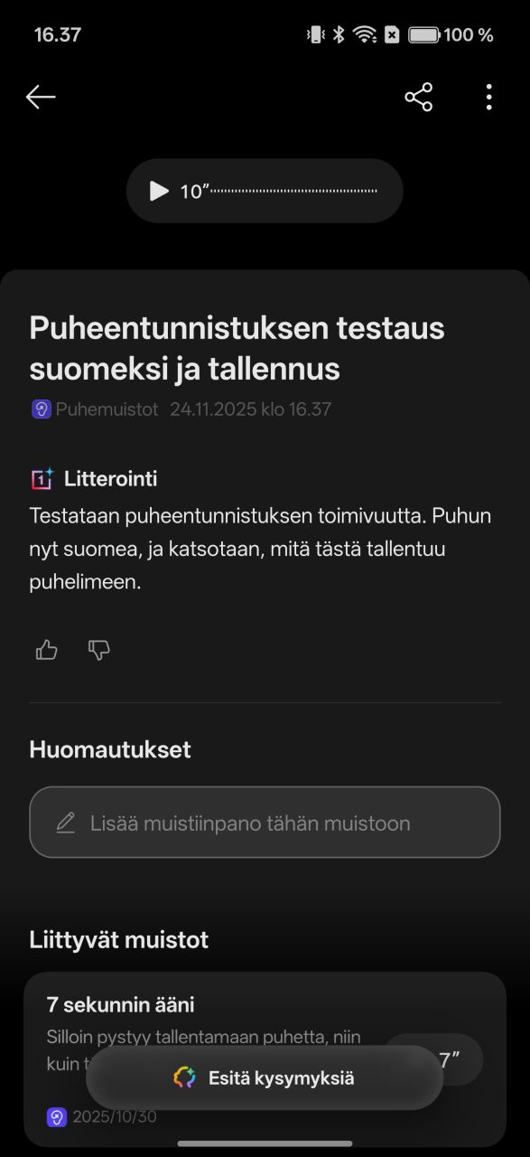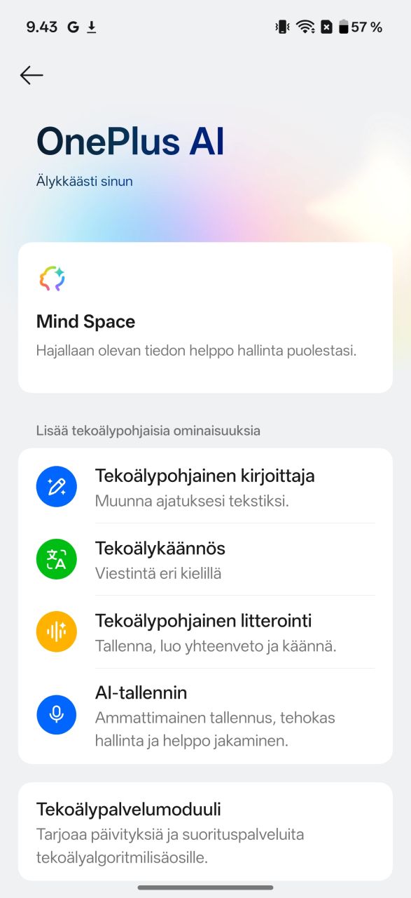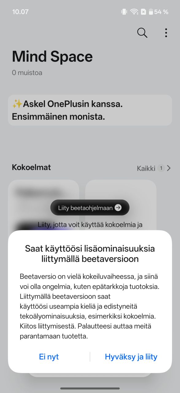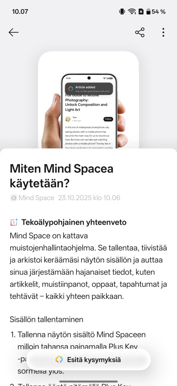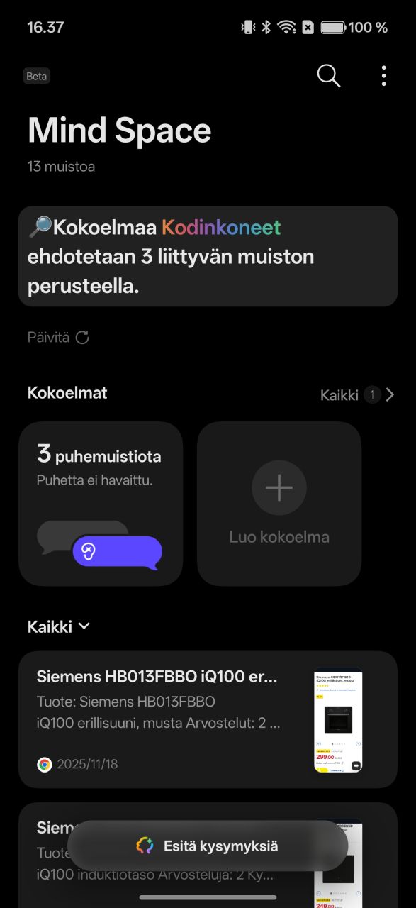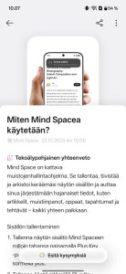 Mind Space on siis käytännössä tekoälyä hyödyntävä kuvankaappausten organisointisovellus. Uutta on Googlen Gemini-integraatio, eli Geminin voi valjastaa etsimään tietoa Mind Spacen sisältä. Käyttäjä voi itse valita, jaetaanko tietoa Geminille vaiko ei. Beetaohjelmaan liittymällä Mind Spacen saa ymmärtämään Suomea sekä puhesyötteen että tekoälyominaisuuksien osalta.