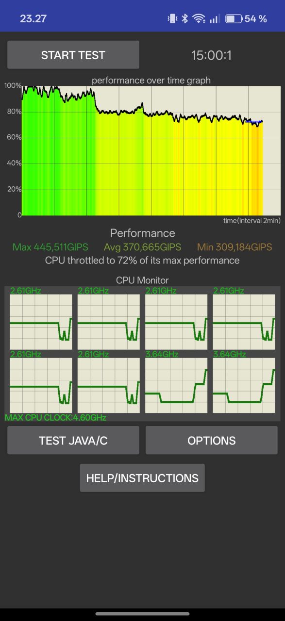CPU Throttling Test -prosessorirasitustestissä tulos on melko hyvä 72 %, mutta vastaavasti 3DMark Wild Life Extreme Stress Test -grafiikkarasitustestissä testisovellus sammui toistuvasti ennen sen päättymistä puhelimen ylikuumenemisen takia. Ylikuumenemisen jälkeen puhelin estää lyhyen hetken ajan myös muiden sovellusten käynnistämisen. 3DMark-rasituksen aikana puhelimen takakuoren yläosasta mitattiin yli 50 asteen lämpötiloja ja kehys lämpeni etenkin yläosastaan epämiellyttävän lämpimäksi.