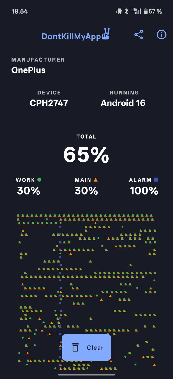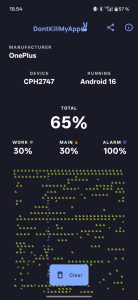 Dontkillmyapp-testisovelluksessa OnePlus 15:n suoritus on parempaa keskitasoa, mutta ei täydellinen, saavuttaen noin 65 % tuloksen. Puhelin tunnistaa kyllä taustalla toimivan testisovelluksen lähes välittömästi ja koittaa ehdottaa sen ”optimoimista”, eli käytännössä taustakäytön rajoittamista. Käytännössä en havainnut testijaksolla taustasovellusten hallinnan haitanneen minkään sovelluksen toimintaa tai ilmoituksia.