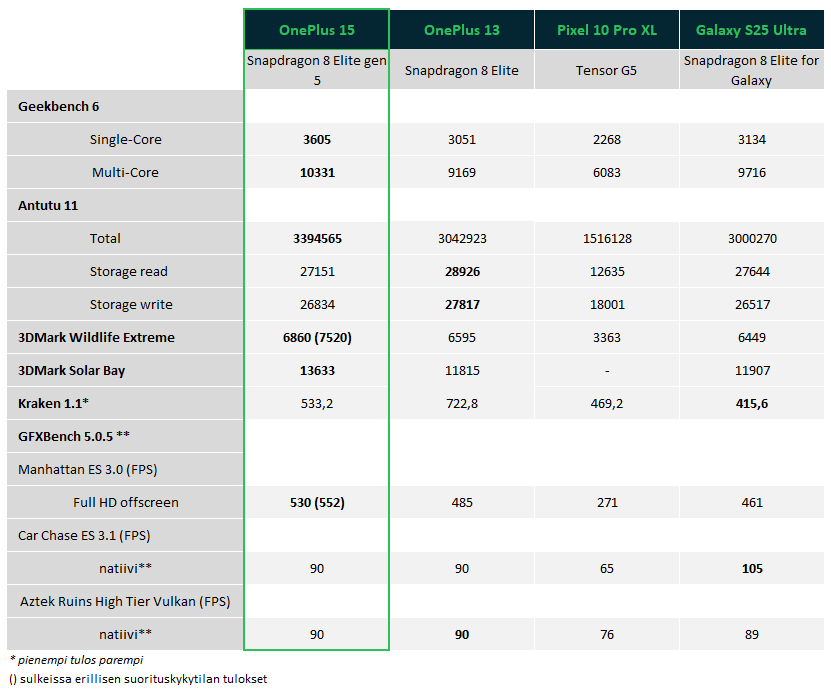 Synteettisissä suorituskykytesteissä OnePlus 15 edusti ensimmäistä io-techin testattavana käynyttä puhelinta uuden sukupolven Snapdragon 8 Elite gen 5 -piirillä. Testiemme perusteella suorituskykyparannus on prosessoripuolella 10–15 % luokkaa parhaisiin testaamiimme edellisen sukupolven puhelimiin verrattuna ja grafiikkapuolella hieman testistä riippuen suunnilleen samaa luokkaa.