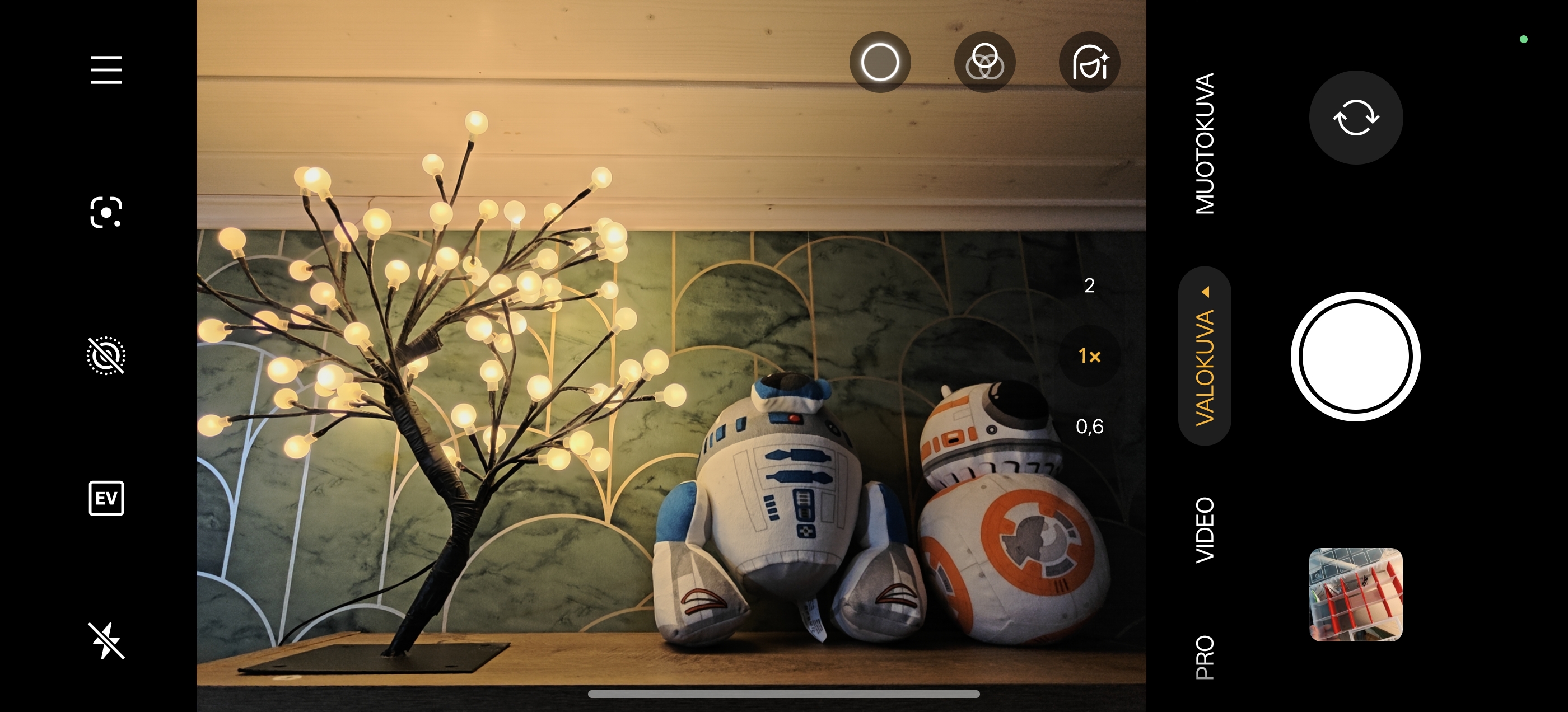 Kamerasovellus on pysynyt ulkoasultaan samana 13R:n kanssa. Kuvassa näkyvän hampurilaisvalikon takaa löytyy mm. kuvasuhteen ja ajastimen asetukset, ja videokuvaukselle vaihdettaessa vasempaan laitaan ilmestyy tarkkuuden ja ruudunpäivitysnopeuden valitsimet.