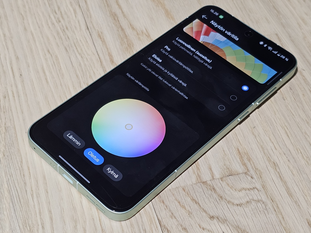 Kädessä puhelin tuntuu jämäkältä ja laadukkaalta, mitä sopii tämän hintaiselta laitteelta odottaakin. Vaikka alumiininen kehys on tasainen, sen reunat eivät tunnu ”teräviltä” kämmentä vasten. Takapuolella on mattapintainen suojalasi, joka ei kerää sormenjälkiä, ainakaan Mint Breeze -värillä. Koon puolesta 15R:ää on yhdellä kädellä hieman hankala käyttää, sillä peukalo ei yksinkertaisesti yllä näytön joka nurkkaan.