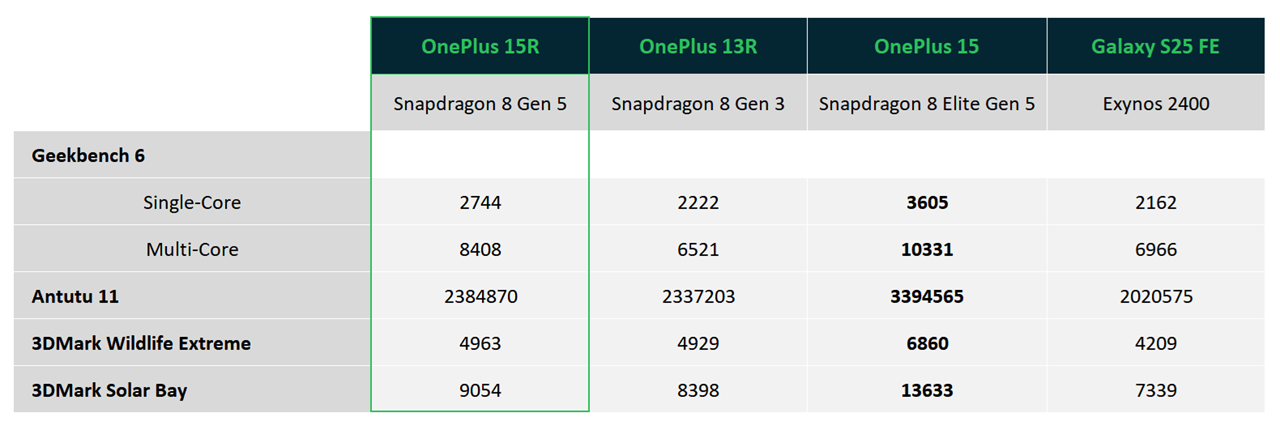 OnePlus on uuteen R-malliinsa tuonut raudan osalta ihan mukavat sukupolvipäivitykset, kuten Qualcommin erittäin suorituskykyisen Snapdragon 8 Gen 5 -järjestelmäpiirin, kun taas 13R:n sisässä sykki toissavuonna julkaistu Snapdragon 8 Gen 3. Aivan markkinoiden kärkipäätä 8 Gen 5 ei edusta, vaan se asemoituu saman valmistajan 8 Elite Gen 5 -huippumallin alapuolelle suorituskyvyltään. Qualcommin nimeämistä ei voi kehua maailman selkeimmäksi.