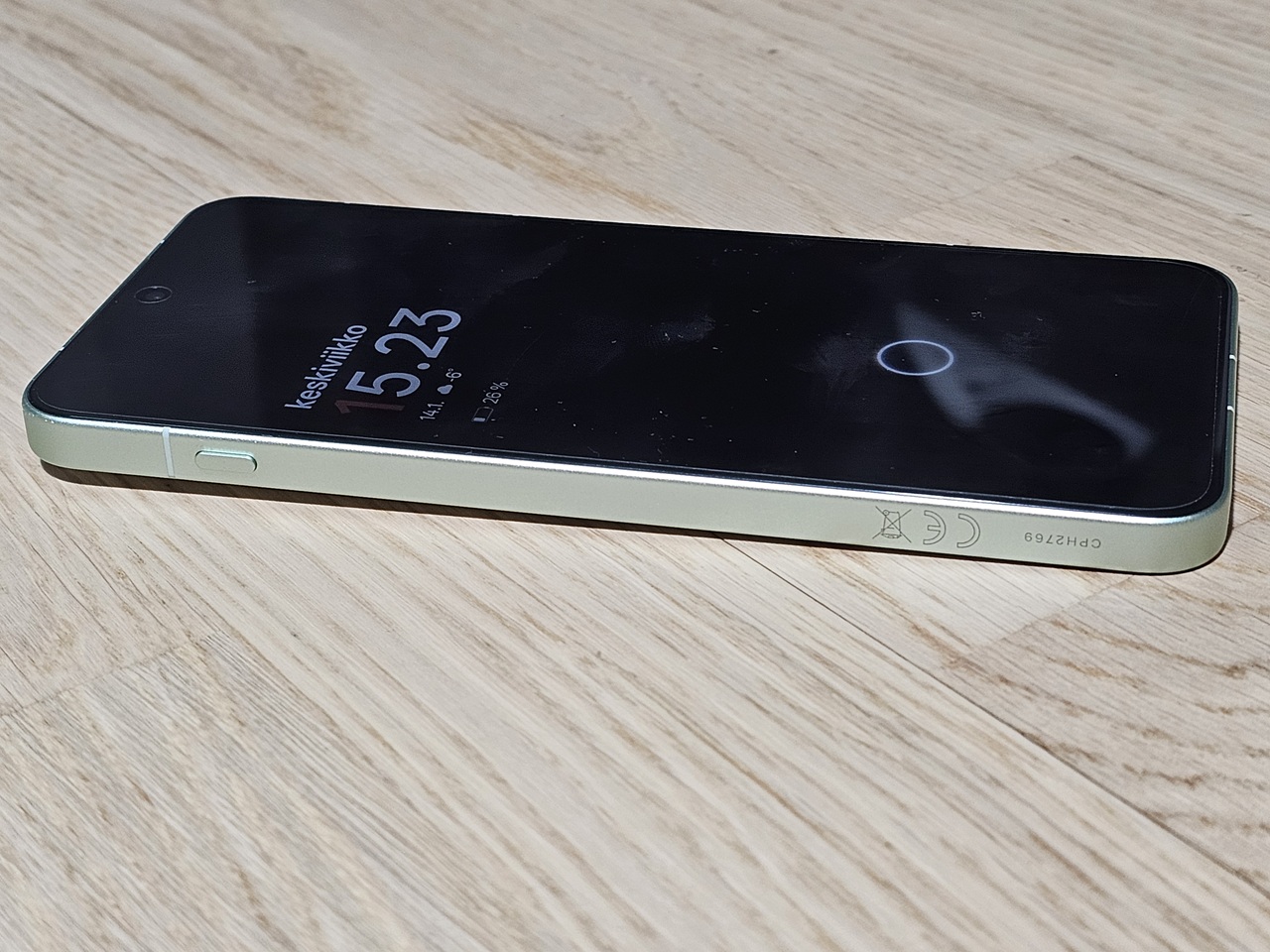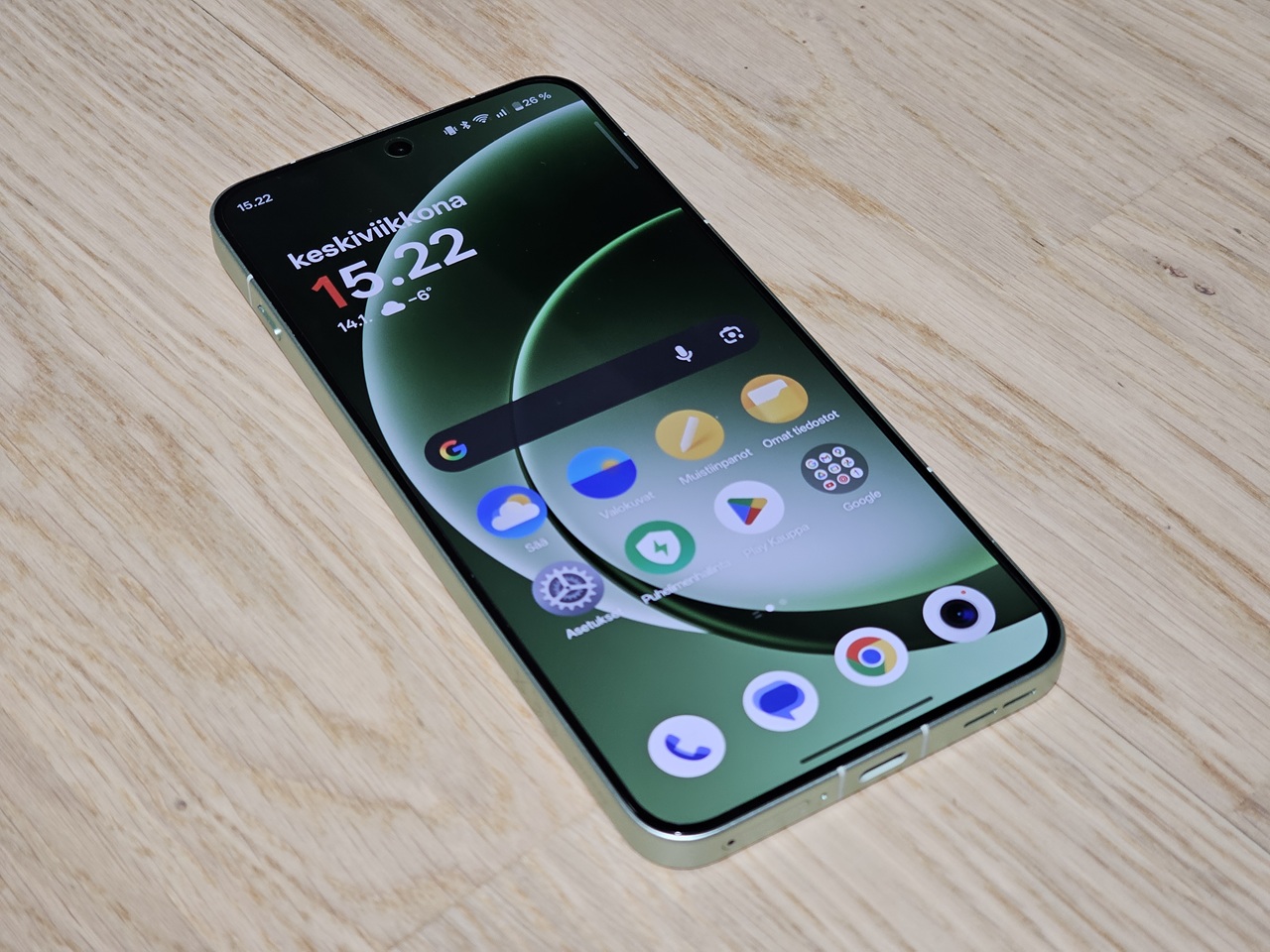 Kädessä puhelin tuntuu jämäkältä ja laadukkaalta, mitä sopii tämän hintaiselta laitteelta odottaakin. Vaikka alumiininen kehys on tasainen, sen reunat eivät tunnu ”teräviltä” kämmentä vasten. Takapuolella on mattapintainen suojalasi, joka ei kerää sormenjälkiä, ainakaan Mint Breeze -värillä. Koon puolesta 15R:ää on yhdellä kädellä hieman hankala käyttää, sillä peukalo ei yksinkertaisesti yllä näytön joka nurkkaan.