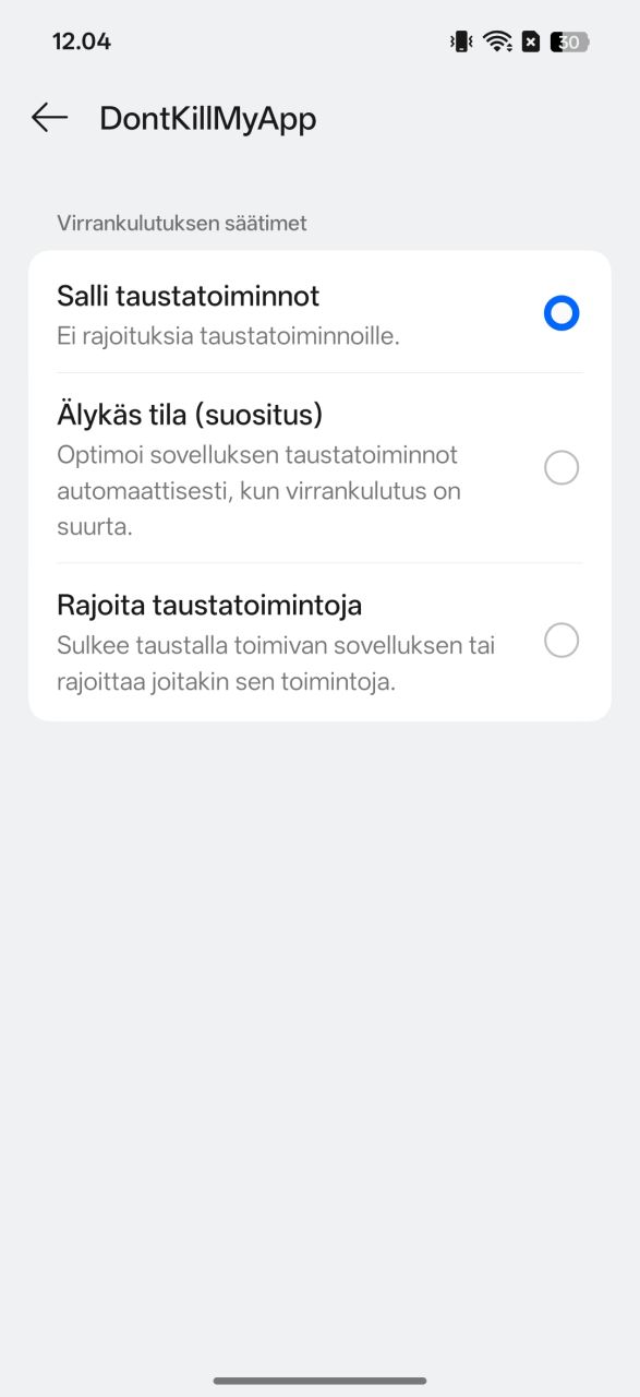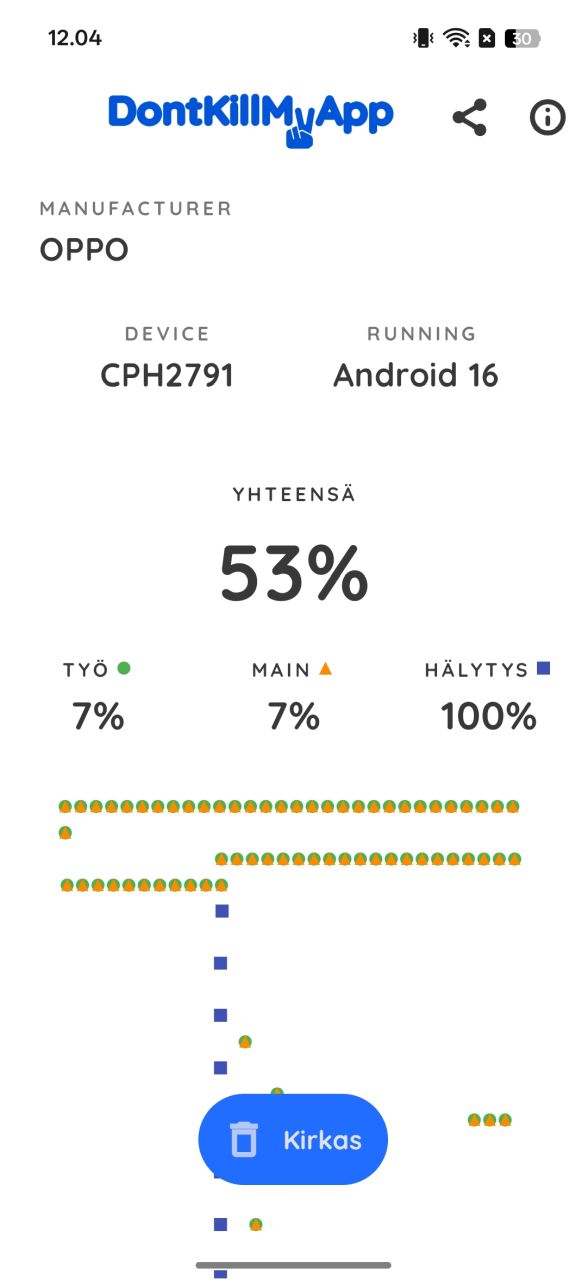 Taustasovellusten hallinnan ankaruutta mittaavasta Dontkillmyapp-testistä Find X9 Pro sai hyvin keskinkertaisen noin 55 % tuloksen. Käytännössä siis vajaa puolet testisovelluksen tuottamista ilmoituksista jäi tulematta läpi. Vielä hieman heikommaksi suorituksesta tekee se, että vaikka säädimme virranhallinnan asetuksista kaikki taustatoiminnot sallituiksi kyseiselle testisovellukselle, ei testitulos muuttunut siltikään paremmaksi, eli rajoitukset tapahtuvat jossain syvemmällä ColorOS-käyttöjärjestelmässä. Tulos on myös huonompi kuin aiemmin testaamallamme sukulaispuhelin OnePlus 15:lla.