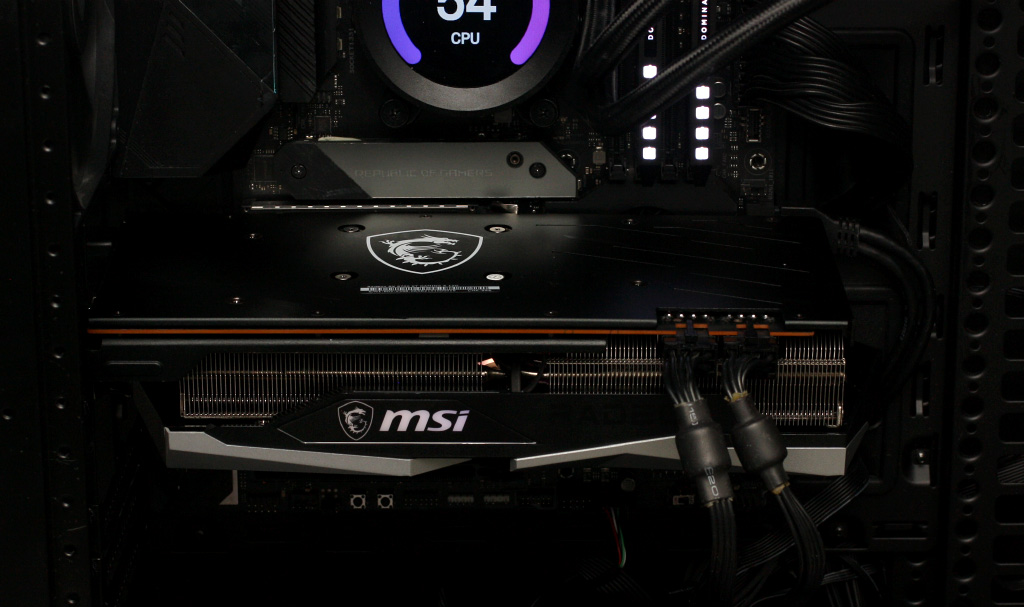 Takapuolella on alumiinilevy, joka on lämpötyynyllä kontaktissa piirilevyyn grafiikkapiirin kohdalta. Piirilevy on varustettu kahdella 8-pinnisellä PCI Express -lisävirtaliittimellä ja päädyn MSI-logo on RGB-valaistu.