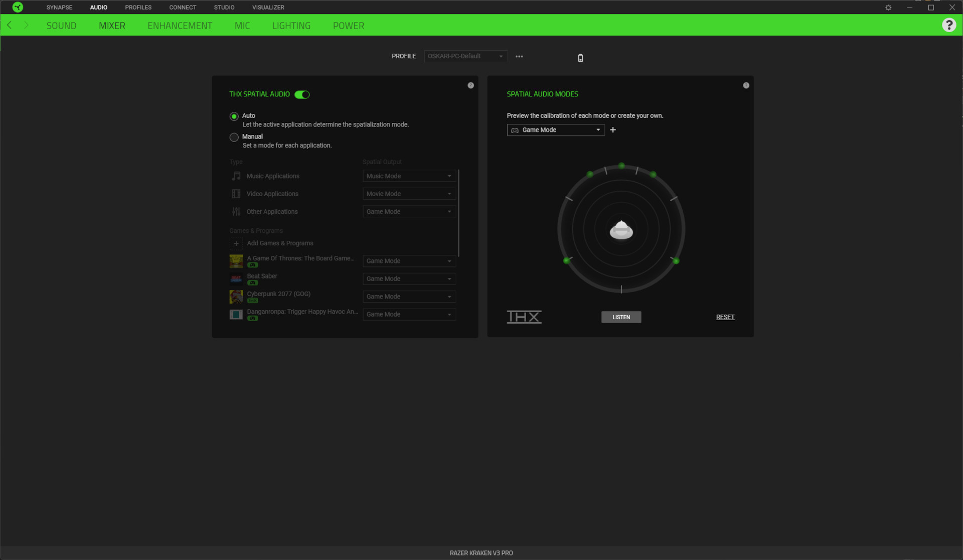Tilaäänimallinnukseen Razer käyttää vanhemmista malleistaan tuttua THX Spatial Audiota, jossa on hieman kustomointimahdollisuuksia virtuaalisten kaiuttimien sijaintiin. Tilaäänimallinnus on luokassaan toimiva, mutta pelien ulkopuolella sitä ei juuri tee mieli käyttää, sillä äänestä tulee sen kanssa hieman etäisen kuuloinen.