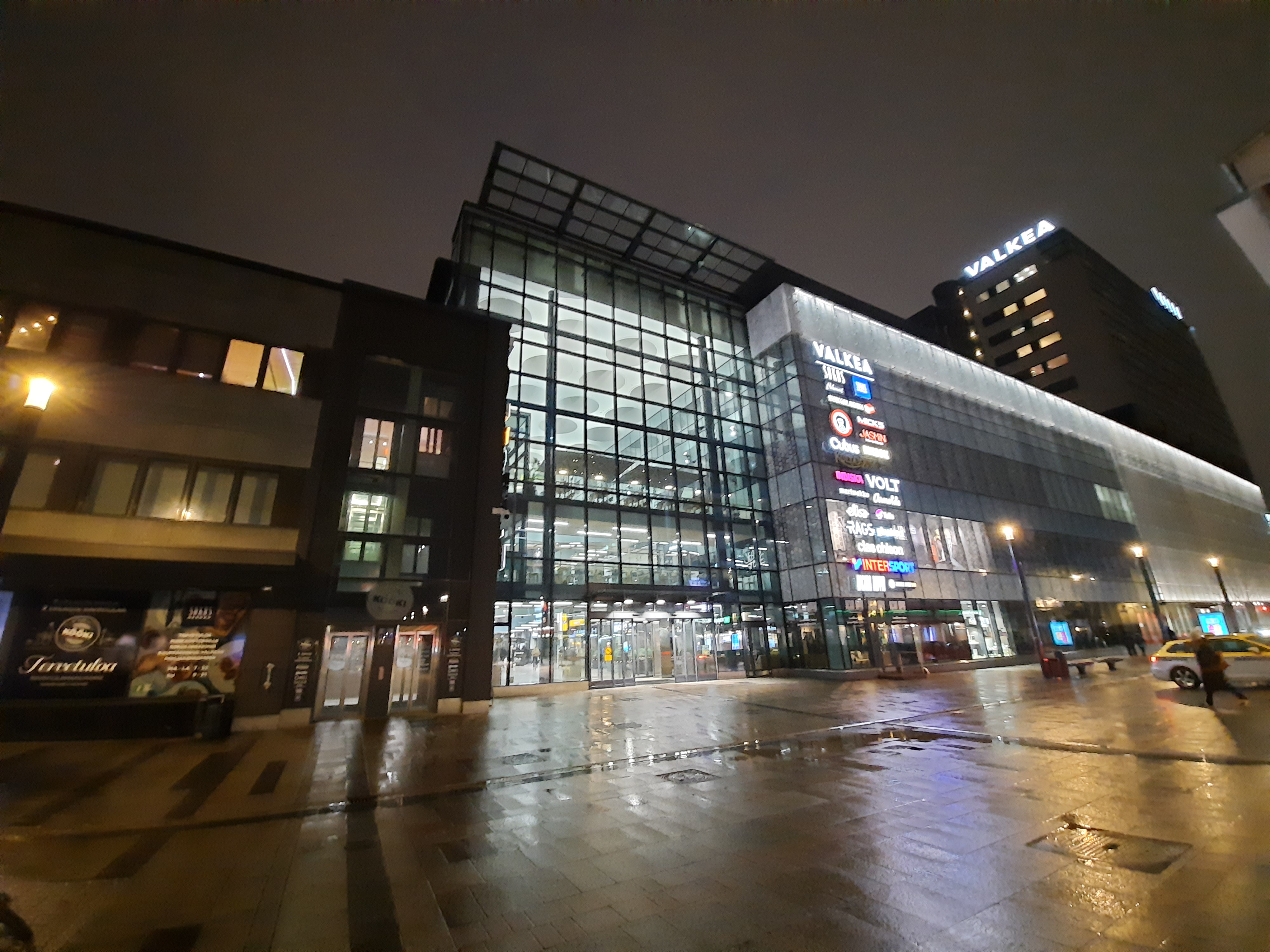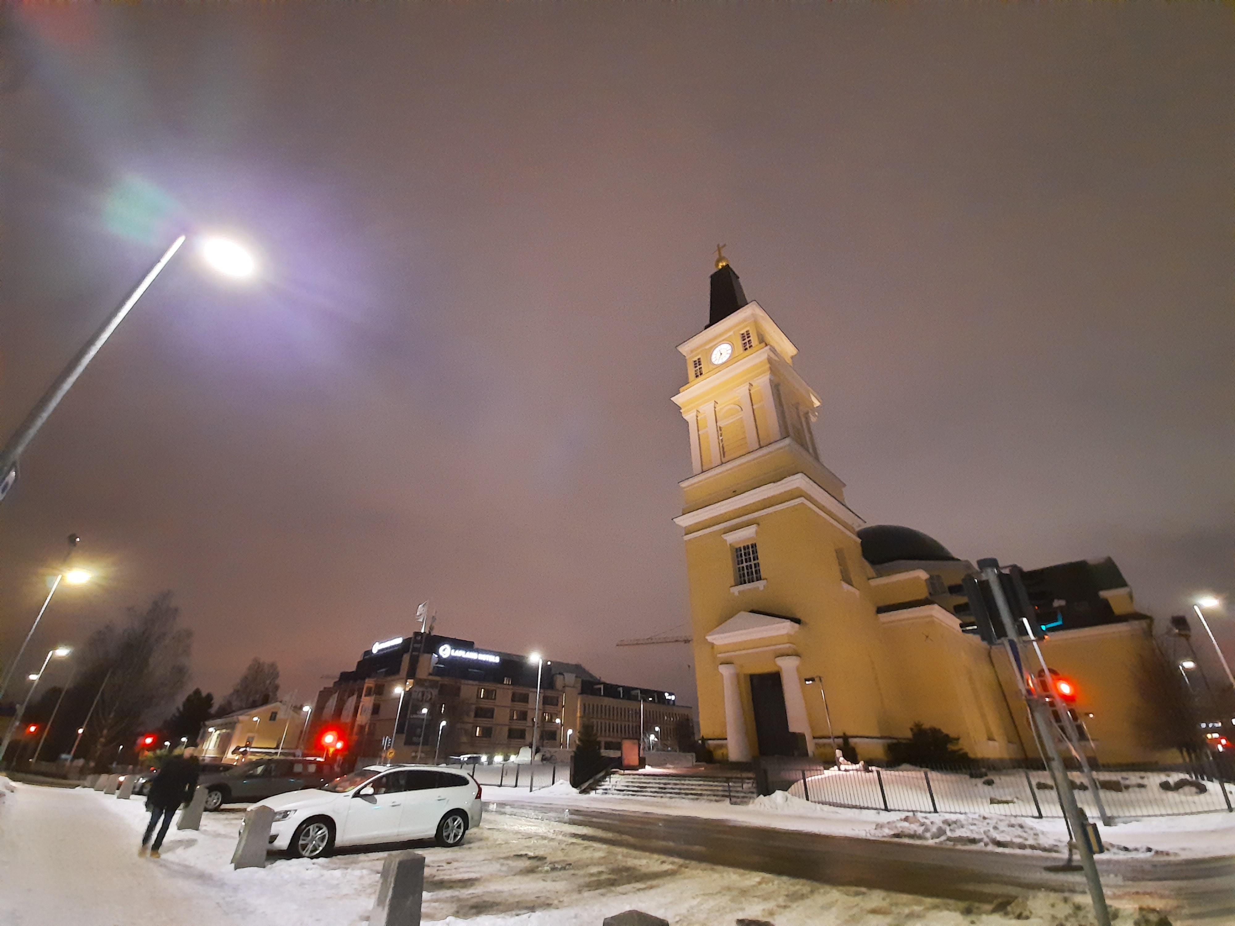 Hämärässä yksityiskohtien määrä tippuu erittäin nopeasti ja kuvista tulee yleisilmeeltään hyvin pehmeitä. Pehmeyttä edesauttaa pääkamerasta tuttu vahvahko kohinanpoisto, jonka ansiosta kuitenkin myös ultralaajakulmakameran kuvat ovat pääosin suhteellisen kohinavapaita. Kohinan esiintyessä se on myös ultralaajakulmakamerassa pääosin yksiväristä. Mielenkiintoisesti ultralaajakulmakameran dynamiikka tuntuu pärjäävän kirkkaiden alueiden osalta pääkameraa paremmin, eivätkä kirkkaat katuvalot tai ilmoitustaulut pala yhtä pahasti puhki. Dynamiikka on kokonaisuudessaan hämärässäkin varsin toimivaa. Galaxy A71:n ultralaajakulmakameran kuvien tasolle A51 ei kuitenkaan yllä speksien valossa vastaavasta kamerasta huolimatta.