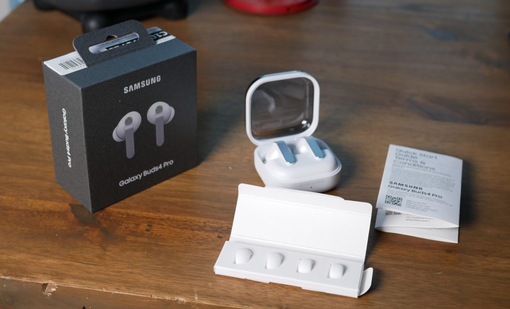 Ulkonäöltään Buds4 Prot ovat omaan silmääni varsin tyylikkäät. Galaxy Buds3 Proiden kolmiomaisesta varsirakenteesta on luovuttu neliskanttisemman ratkaisun tieltä. Kuulokkeiden ulkopinta on alumiininen, mikä toimii ainakin valkoisen värivaihtoehdon kanssa varsin miellyttävän näköisenä kontrastina, joskin samalla edellismallista löytyneistä valonauhoista on luovuttu.