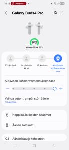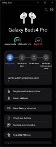 Ohjelmistopuolella Galaxy Buds4 Prot integroituvat Samsungin puhelimissa automaattisesti suoraan asetuksista löytyväksi. Muiden Android-puhelinten kanssa kuulokkeet käyttävät Galaxy Wearable -sovellusta. Apple-puhelinten käyttäjille tarjolla ei edelleenkään harmillisesti ole sovellusta, mutta positiivisena puolena Samsung tarjoaa nykyään Windows-tietokoneille Store-kauppapaikalta saatavan Galaxy Buds -sovelluksen, jolla kuulokkeiden hallinta onnistuu PC:n kautta. Testijaksolla kuulokkeita käytettiin Samsungin puhelimen kanssa, jotta saimme käyttöön täyden ominaisuuskirjon.