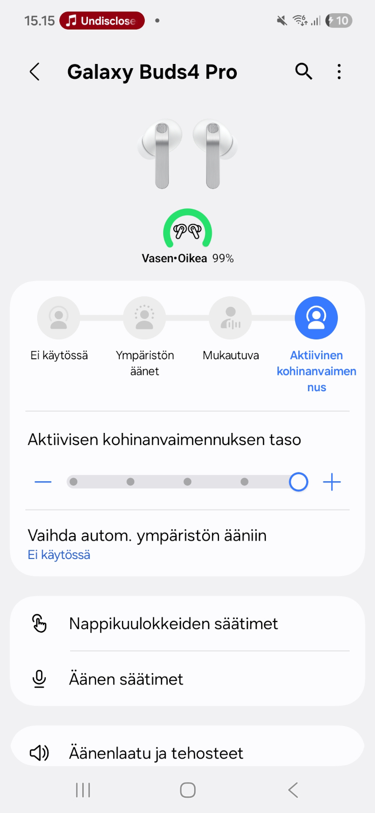Läpikuuluvuustila napeissa on hyvä ja tasapainoisen kuuloinen, mutta sekään ei aivan markkinoiden kärkitekijäksi yllä. Äänenlaatu itsessään on huippuluokkaa, mutta Samsungin napeissa syntyy taustalle kohtalaisen paljon suhinaa, jota omaan korvaani tällä hetkellä parhaiten toimineissa Applen AirPods Pro 3:issa ei kuulu. Lisäksi Applen napit onnistuvat pitämään myös käyttäjänsä oman puheäänen hämmentävän luonnollisen kuuloisena, kun Samsungin kanssa se muuttuu hieman.