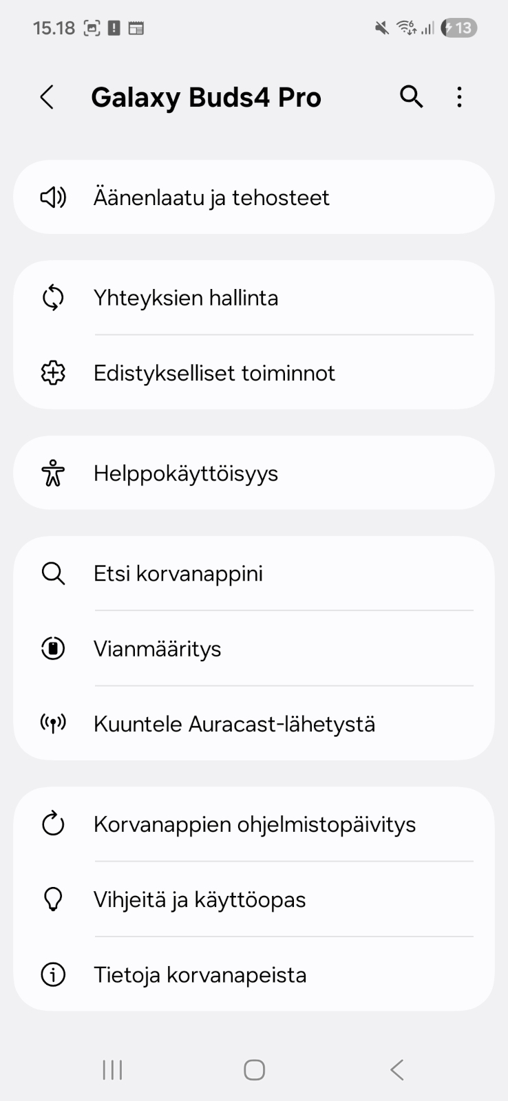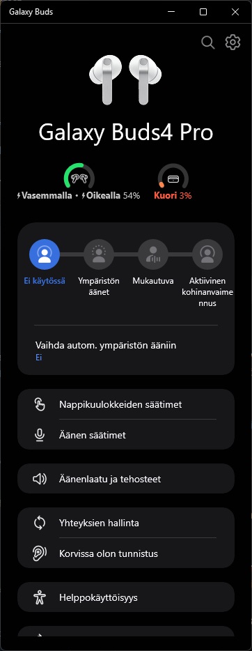 Ohjelmistopuolella Galaxy Buds4 Prot integroituvat Samsungin puhelimissa automaattisesti suoraan asetuksista löytyväksi. Muiden Android-puhelinten kanssa kuulokkeet käyttävät Galaxy Wearable -sovellusta. Apple-puhelinten käyttäjille tarjolla ei edelleenkään harmillisesti ole sovellusta, mutta positiivisena puolena Samsung tarjoaa nykyään Windows-tietokoneille Store-kauppapaikalta saatavan Galaxy Buds -sovelluksen, jolla kuulokkeiden hallinta onnistuu PC:n kautta. Testijaksolla kuulokkeita käytettiin Samsungin puhelimen kanssa, jotta saimme käyttöön täyden ominaisuuskirjon.