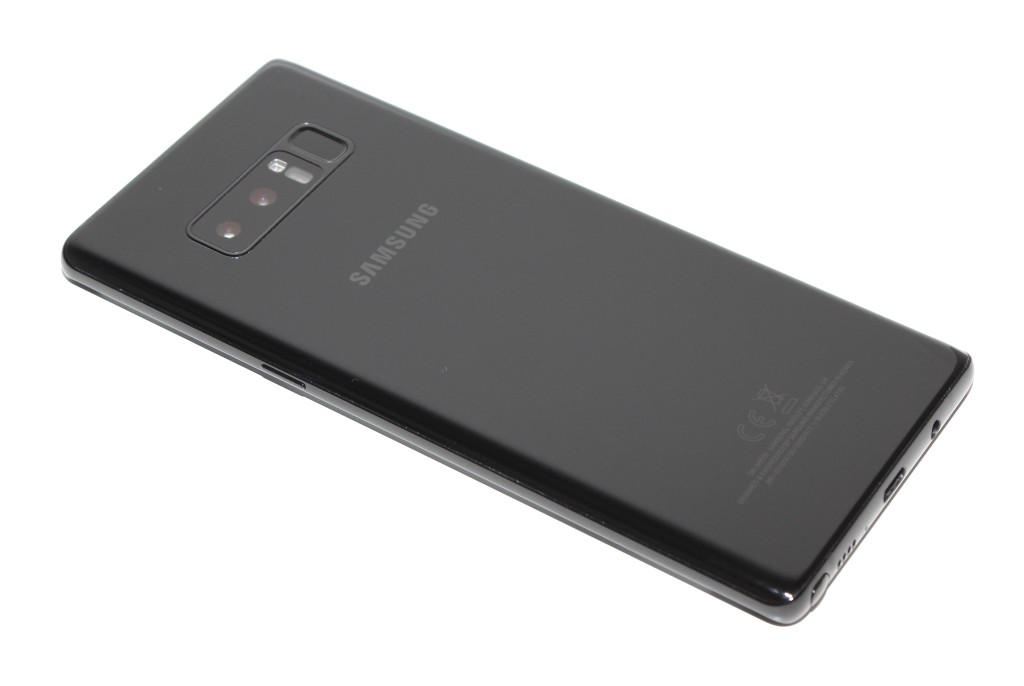 Note8:n takakuori on 3D-muotoiltua Gorilla Glass 5 –lasia, eli se on pyöristetty sekä pitkien että lyhyiden sivujen suuntaan. Pitkien sivujen kaarevat reunat ovat toteutettu symmetrisesti näyttölasin reunojen kanssa. Pyöristyksen ansiosta Note8 istuu mukavasti kouraan ja metallikehyksen minimaaliset reunat parantavat osaltaan hieman puhelimesta saatavaa otetta.