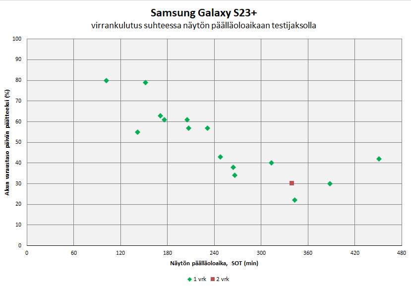 Galaxy S23+:n akunkesto on käytännön testijakson havaintojen perusteella parantunut havaittavasti edeltäjämalli S22+:aan nähden. Ero S23-perusmalliin on kuitenkin hieman pienentynyt. Yhden päivän aikana akun varaus laski tyypillisesti noin 60 % tietämille, kun näytön päälläoloaika oli 3-3,5 tuntia. Parhaimmillaan päivässä päästiin 6-7,5 tunnin näytön päälläoloaikoihin ja varausta oli edelleen jäljellä 20-40 %. Kahden päivän ylitys suoritettiin kertaalleen ongelmitta vajaan kolmen tunnin päivittäisellä näytön päälläoloajalla.