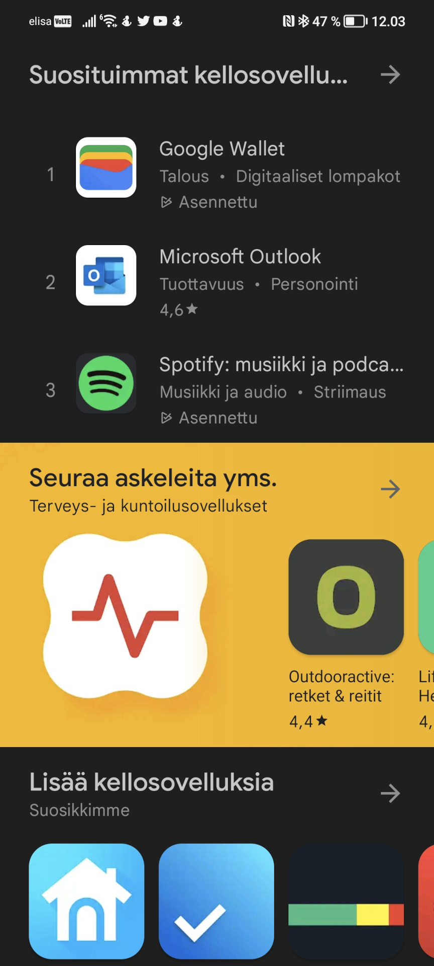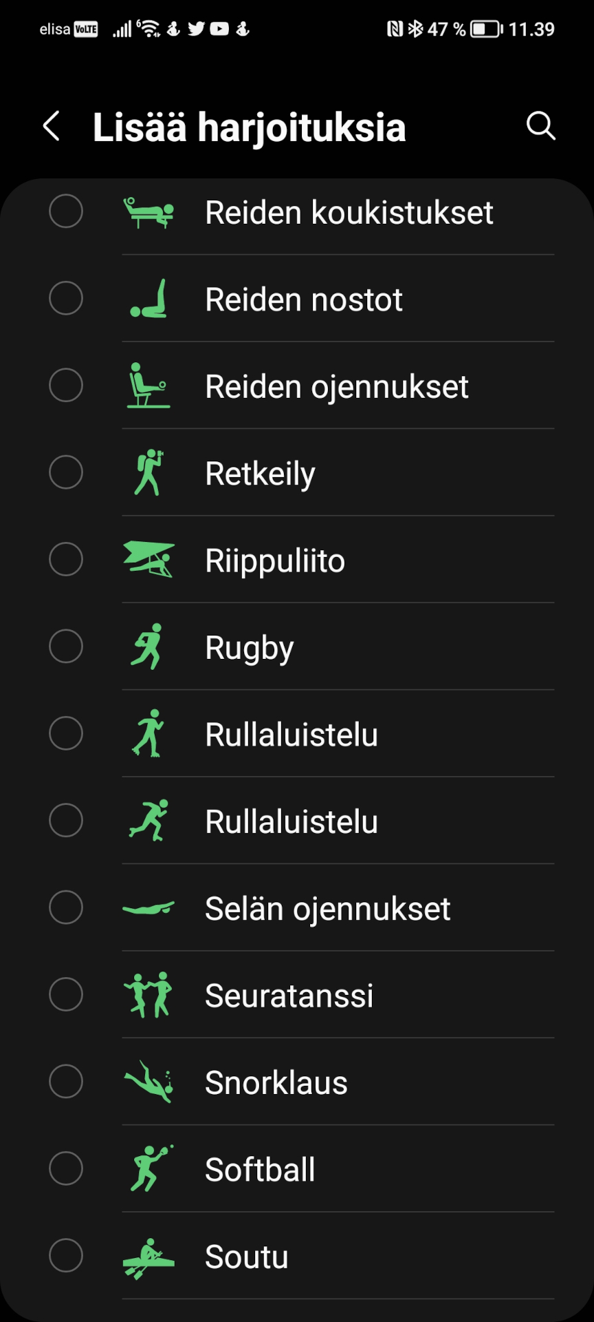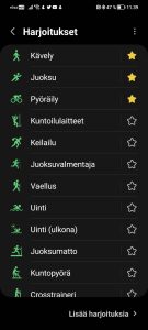 Liikuntatiloja Samsung tarjoaa moneen makuun ja WearOS:ää käyttävänä kellona lisääkin voisi olla saatavilla, mikäli Play-kaupasta lataa jonkin toisen liikuntasovelluksen.