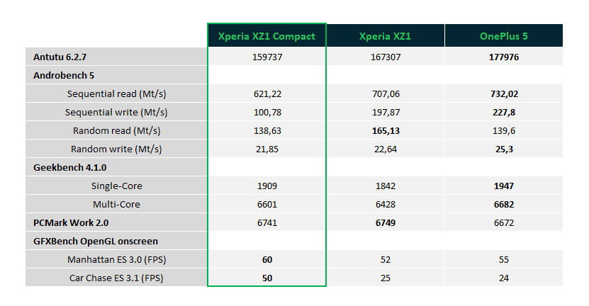 Xperia XZ1 Compactin tulokset myötäilevät Xperia XZ1:n vastaavia lukuun ottamatta graafista suorituskykyä, jolloin pienemmän resoluution ansiosta Compact saa paremman tuloksen verratessa XZ1:een ja OnePlus 5:een.