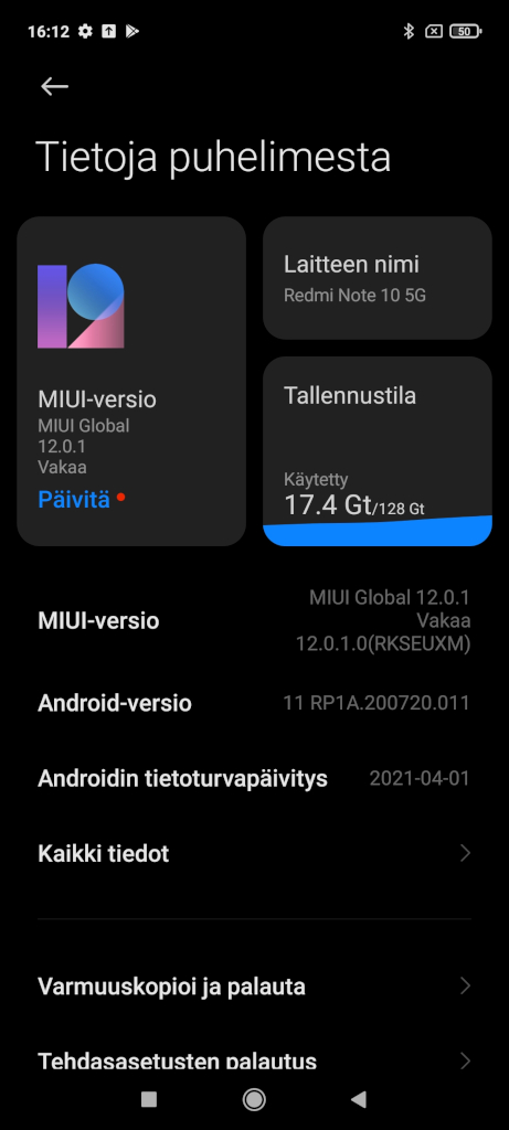 Redmi Note 10 5G:n sisällä pyörii Androidin tuorein 11-versio, jonka päällä pyörii valmistajalle totuttuun tapaan MIUI 12 -käyttöliittymä. Testijaksolla MIUI päivittyi versioon 12.0.9 ja Androidin tietoturvakorjaukset kesäkuun tasolle, eli Android-päivitysten suhteen puhelin on hyvin ajantasainen.