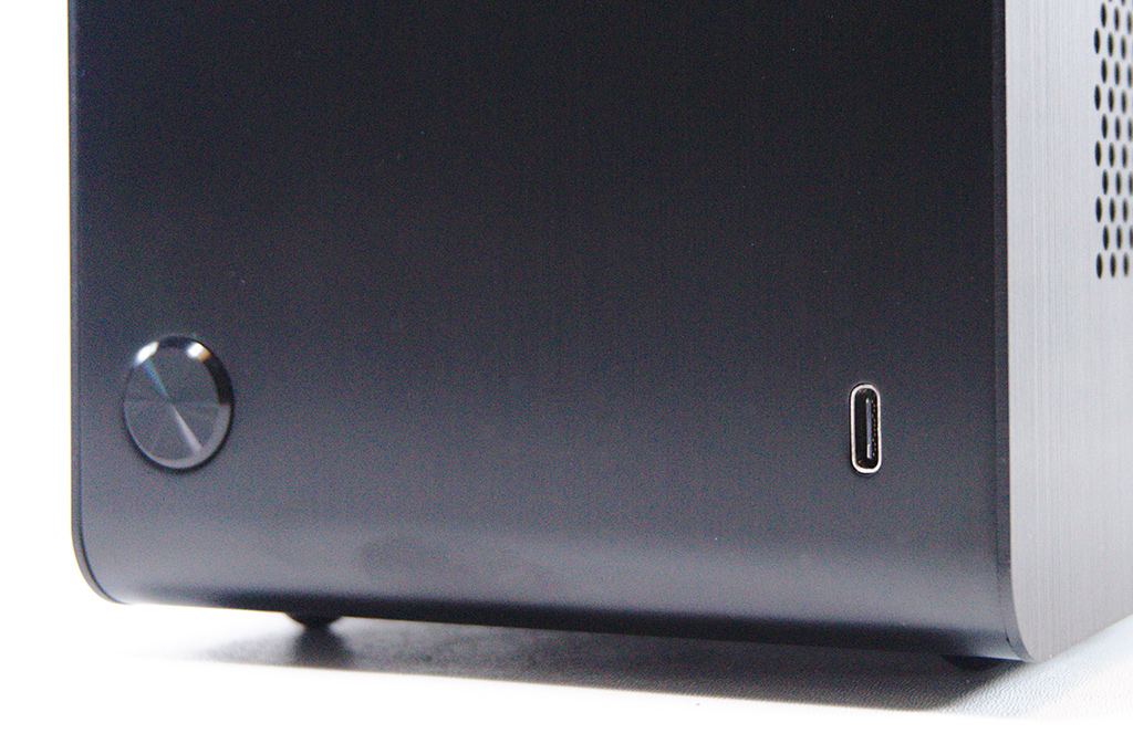 Etupaneeli itsessään on erittäin pelkistetty. Siitä löytyvät ainoastaan virtapainike ja USB Type-C -liitäntä. Type-C-liitäntä käyttää tuoreehkoa Type-C:n omaa USB 3.1 gen 2 -emolevyliitäntää, joka alkaa vasta vähitellen yleistyä emolevyissä. Tämän seurauksena testikokoonpanolla liitäntää ei valitettavasti voinut kytkeä. Käytännössä pelkkään USB 3.2 gen 2 -liitäntäiseen USB Type-C liittimeen nojaava etupaneeli onkin kotelossa käyttäjästä riippuen suhteellisen suurikin miinus. Suurin osa tietokoneiden USB-liitäntäisistä laitteista käyttää edelleen perinteistä USB Type-A -liitäntää, joten vähintään yhden sellaisen löytyminen kotelosta vanhempiin emolevyihin sopivalla sisäisellä liitännällä olisi edelleen toivottavaa. Virtapainike on pinnoitteeltaan muuta koteloa karheampaa alumiinia ja siinä on napakka napsahtava tuntuma. Yli 200 euron hintaluokassa virtapainikkeessa on kuitenkin harmillisen paljon ”löysää” ja se liikkuu huomattavasti.