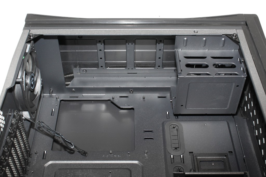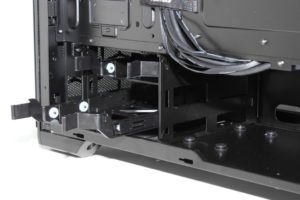 Oikean kylkipaneelin takana odottaa ylhäältä alas asti ulottuva väliseinä, joka poikkeaa viime vuosina vallalla olleesta trendistä. Kaksi 2,5 tuuman levykelkkaa sijaitsevat keskellä väliseinän etuosaa ja ne ovat kiinni yhdellä sormiruuvilla. Levyt kiinnitetään kelkkoihin pohjasta ruuveilla. Prosessorikannan takana sijaitseva asennusaukko on suurikokoinen ja peittää lähes koko emolevyn ylempien kiinnitysruuvien välisen alueen.