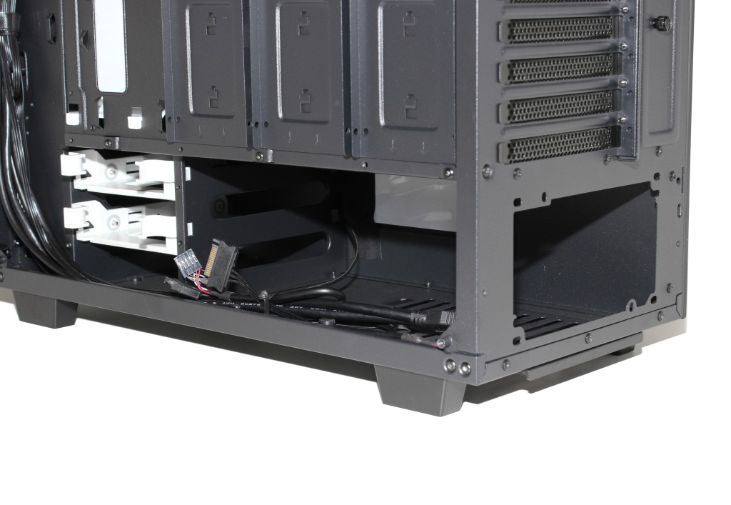 Kotelon pohjalle on puolestaan sijoitettu toinen levykehikko, jossa on paikat kahdelle 3,5 tuuman levylle. Kehikko on kiinni pohjassa sormiruuveilla, joten sen saa tarvittaessa siirrettyä pois esimerkiksi nestejäähdytysasennusten tieltä. Levyjen kiinnittäminen molempiin kelkkoihin tapahtuu pikakiinnitteisillä muovikiskoilla. Etupaneelissa on paikat kahdelle 120 tai 140 mm tuulettimelle, joiden sijaintia on mahdollista hienosäätää pystysuunnassa.