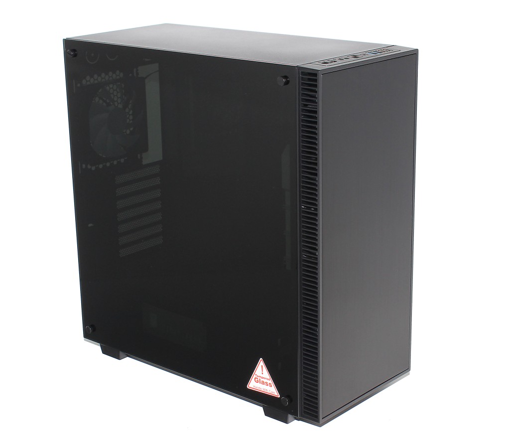Kuten sanottua, TG-01:n etupaneeli on rungoltaan muovia, mutta sen pintaan on kiinnitetty nelimillinen karkaistu lasilevy, jonka merkitys on puhtaasti visuaalinen. Ilmanotto tapahtuu etupaneelin kylkien kautta, mikä varmasti osaltaan vaimentaa kotelon sisältä tulevaa melua, mutta samalla rajoittaa merkittävästi etutuulettimien ilmansaantia.