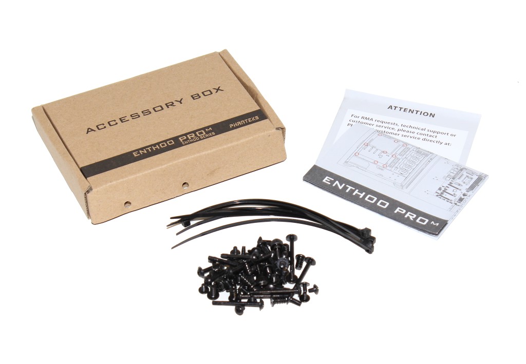 Kotelon ohella pakkauksen mukana toimitetaan käyttöohjeet, pussillinen ruuveja, muutama nippuside, piippari, levypaikkojen kiinnityskiskoja sekä RGB-valaistuselementti SSD-levylle.