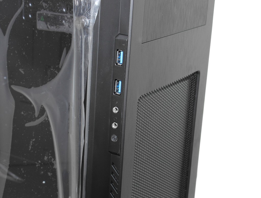 Etupaneelin liitäntävalikoimaan kuuluu kaksi USB 3.0 –liitäntää sekä kaksi vanhempaa USB 2.0 –liitäntää sekä perinteiset 3,5 mm kuuloke- ja mikrofoniliitännät. Merkkivalot on toteutettu pieninä pisteinä ääniliitäntöjen viereen. USB-liitäntöjen toteutus vaikuttaa hieman halvalta ja liittimen työntäminen liitäntään tuntuu hieman ”tahmealta”.