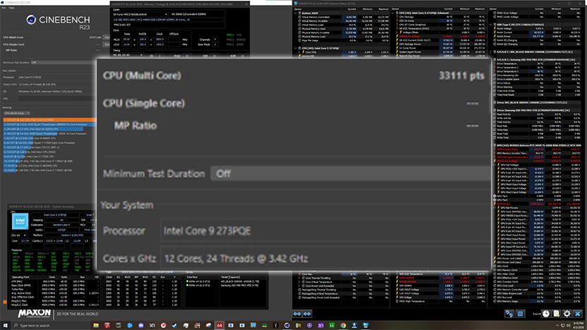Nimimerkki ’CarSalesmanin’ käsissä Core 9 273QPE saavutti Cinebench R23:n moniydintestissä 33 111 pistettä, mikä asettaisi sen Ryzen 9 9900X3D:n ja Core i7-14700:n välimaastoon. Prosessoin kaikki ytimet toimivat testissä 5,4 GHz:n Boost-kellotaajuudella ja prosessori hörppi 286 wattia virtaa.