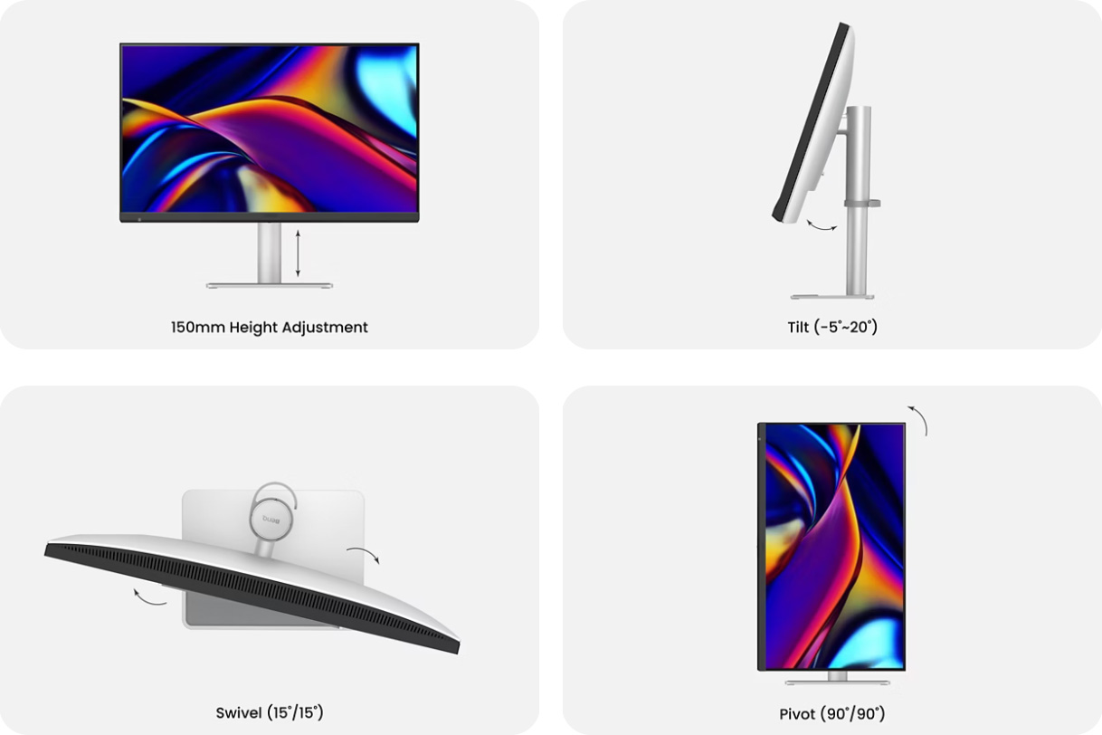 Näytön jalusta tukee korkeuden säätöä 150 mm:n säteellä, kallistusta -5° – +20°, kääntämistä 15° suuntaansa ja vielä pivot-ominaisuuttakin. Sen hinta on yhtiön Euroopan kaupassa 1007,33 euroon, mutta kauppa ei toimi Suomessa. BenQ-näytöjä on kuitenkin yleisesti saatavilla myös Suomessa ja näytön pitäisi tiettävästi ilmestyä jälleenmyyntiin tämän kuun aikana.