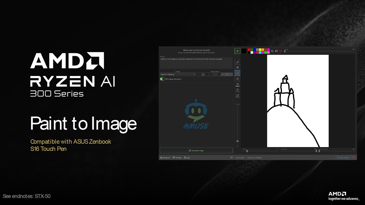 AMD:n Ryzen AI -prosessorit kannettaviin täyttävät ja ylittävät Microsoftin asettaman 40 TOPSin rajan NPU-kiihdyttimen suorituskyvylle. Windowsin sisäänrakennettujen tekoälytoimintojen lisäksi yhtiö tekee tiivistä yhteistyötä laitevalmistajien kanssa tuodakseen käyttäjille lisää tekoälykokemuksia. Acer LiveArtin avulla käyttäjä voi ottaa kuvan tietystä asennosta ja luoda uusia kuvia, jossa toistetaan sama hahmon asento. Asuksen StoryCuben puolestaan kerrotaan avustavan käyttäjää tiedostojen hallinnassa, kun HP:n AI Companion lupaa optimoida laitteen ominaisuuksia paremman tuottavuuden nimissä. AMUSE 2.0 tarjoaa puolestaan Stable Diffusionia hyöntävää kuvanluontia ja se osaa ottaa lähteeksi sekä teksti että piirretyn luonnoksen halutusta kuvasta.