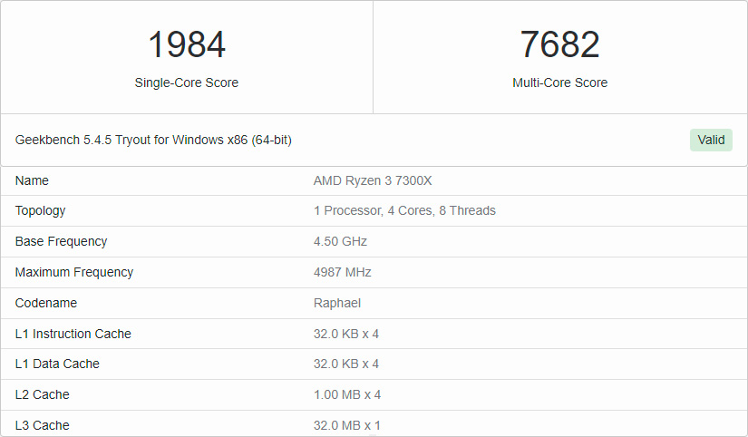 Prosessorin minimi, maksimi ja keskimääräiset kellotaajuudet testin aikana ovat olleet 4704, 4941 ja 4918 MHz. Geekbenchin raportin mukaan peruskellotaajuus olisi 4,5 GHz ja maksimi Boost 4978 MHz. Ryzen 3 7300X sai testissä ydhellä ytimellä 1984 ja kaikilla ytimillä 7682 pistettä. Verrattuna Zen 3 –arkkitehtuurin Ryzen 7 5800X:ään (8 ydintä, 16 säiettä) prosessorin yhden ytimen suorituskyky on 14,8 % parempi ja kaikkien ydinten 28,5 % heikompi.
