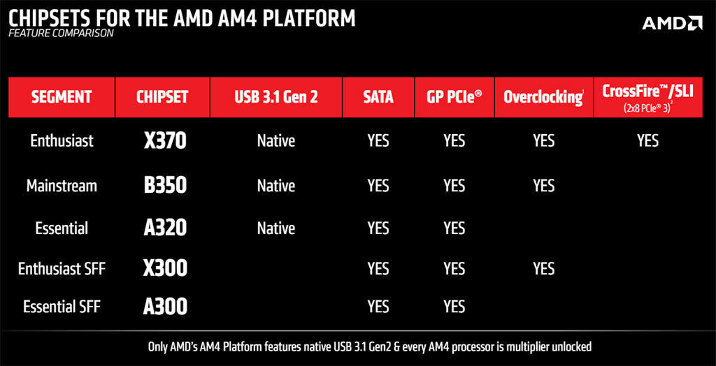 Uusista AM4-prosessorikantaa tukevista piirisarjoista ylikellottamista tukevat X370-, B350- ja X300-piirisarjat ja kahden näytönohjaimen CrossFire- ja SLI-konfiguraatioita tukevat ainoastaan X370-piirisarja. Tuettuna on 16 PCI Express 3.0 -linjaa eli kahden näytönohjaimen konfiguraatioissa molemmat näytönohjaimet toimivat x8-nopeudella.