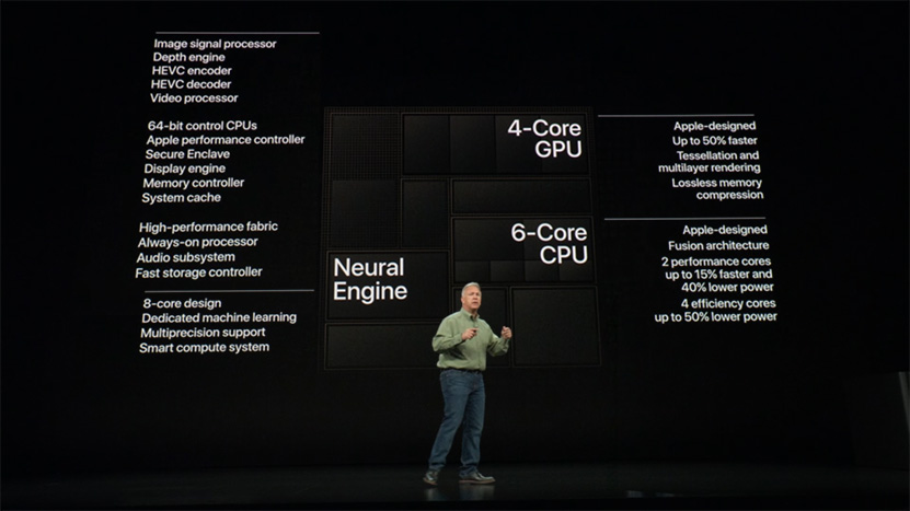 Applen uusi A12 Bionic -järjestelmäpiirin merkittävimmät elementit ovat uusi 6-ytiminen prosessori, 4-ytiminen grafiikkaohjain ja 8-ytiminen Neural Engine -tekoälylaskuihin erikoistunut prosessori. Luonnollisesti järjestelmäpiiriltä löytyvät myös ajanmukaiset turvaprosessorit, mediayksiköt, kuvaprosessorit ja muut vastaavat. Järjestelmäpiiri valmistetaan 7 nanometrin valmistusprosessilla ja se rakentuu 6,9 miljardista transistorista. Järjestelmäpiirin pariksi saa jatkossa enimmillään 512 Gt tallennustilaa.