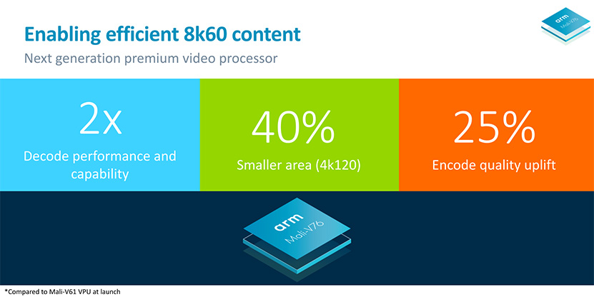 Kolmas ARM:n uutuus on Mali-V76-videoprosessori. Videoprosessori on suunniteltu 8K-materiaalille ja sen luvataan tarjoavan kaksinkertaista purkusuorituskykyä, vievän 40 % vähemmän tilaa (4k120-materiaalille optimoituna versiona) ja parantavan pakkauslaatua 25 prosentilla samalla bittivirtanopeudella.