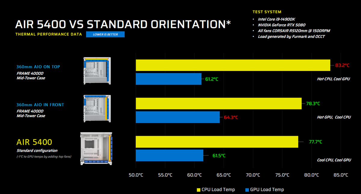 Corsair AIR 5400 voi ensi silmäyksellä vaikuttaa perinteiseltä akvaariomallin miditornikotelolta, mutta tarkemmin katsoessa huomaa sen olevan selvästi normaalia leveämpi, mikä jättää tilaa täyskokoisille tuulettimille etupaneelin lasiosuuden viereen. Kotelo julkaistaan kahtena versiona, joista toisessa on esiasennettuna kolme RS120-R ARGB –tuuletinta ja toisessa kolme LX120-R iCue Link RGB –tuuletinta, kummatkin käänteisin lavoin.
