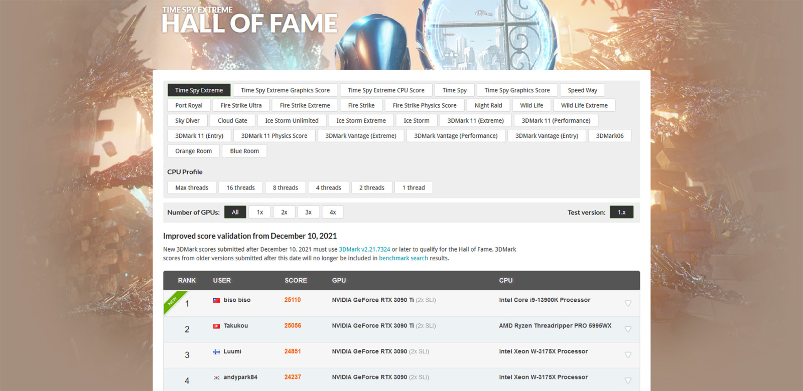 UL Benchmarks on poistanut Luumin ennätystuloksen ja samalla HWBotin sääntöjä on päivitetty siten, että GeForce RTX 4090 -näytönohjaimilla on oltava ECC-virheenkorjaus käytössä NVIDIAn asetuksista. UL Benchmarksin edustaja on käynyt läpi Luumin ajon ja vaikuttaisi siltä, kuin ajon loppumetreillä olisi jokin bugannut ECC:n puutteen vuoksi. Luumille jäi kuitenkin takataskuun 3. sijaan oikeuttava tulos, samat 11 680 pistettä kuin aiempi ennätys.