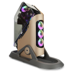 InWin kertoo puoli kierrosta taittuvan ja 6 mm:n paksuisen lasipaneelin olevan ensimmäinen laatuaan PC-koteloissa ja vaativan jopa 12 tunnin valmistusprosessin, jossa lasia vahvistetaan kemiallisesti ja siihen myös lisätään suojaava kalvopinnoite. Niin ikään kaarevasti muotoiltuun alumiinirunkoon kiinnitettävät komponentit saa esiin lasipaneelin takaa saranamekanismin avulla yhden napin painalluksella, eikä perinteisiä irrotettavia paneeleja siis ole. Koko komeus lepää jykevällä, ovaalin muotoisella jalustalla, jossa saranamekanismikin sijaitsee.
