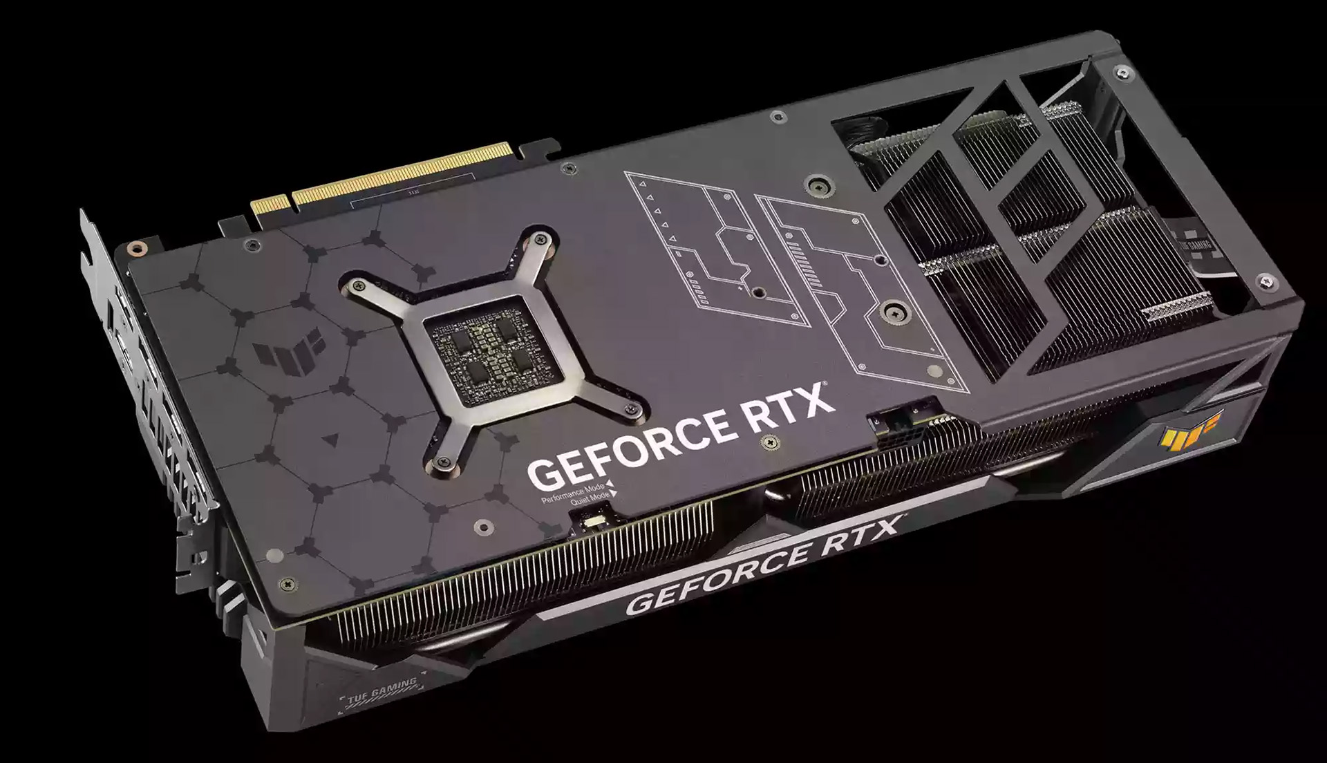 TUF Gamingin puolella mennään vielä paksumpaan suuntaan ja näytönohjaimen virallinen vyötärömitta on 3,65 korttipaikkaa. Coolerin kolme tuuletinta ovat Strix-sisaruksen tavoin aiempaa kookkaampia ja ne puhaltavat ilmaa läpi huomattavasti piirilevyään pidemmän alumiinirivaston. Alumiinirivastolle lämpö johdetaan uudelleen suunnitellusta höyrykammiosta yhteensä viiden 8 mm:n ja kolmen 6 mm:n lämpöputken voimalla. Näytönohjaimen RGB-valaistus on maltillista rajoittuen kolmiulotteiseen TUF-logoon.
