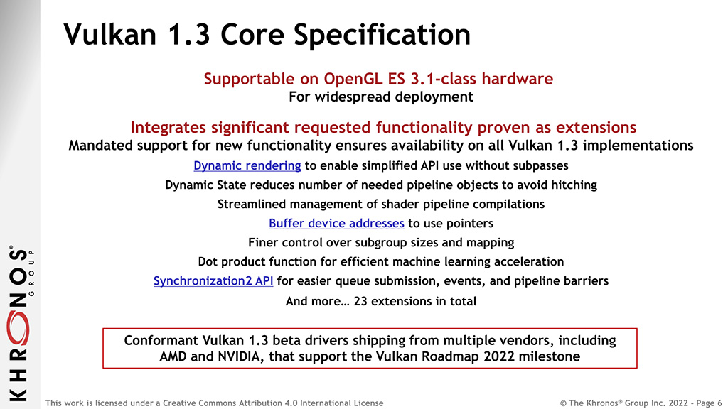 Vulkan 1.3:n ydin on suunniteltu siten, että se on toteutettavissa OpenGL ES 3.1 -tasoa tukevalla raudalla, mikä helpottaa sen käyttöönottoa, mutta samalla rajaa kehittyneemmän raudan pääsyä oikeuksiinsa ydinrajapinnalla. Päivityksessä on Khronoksen mukaan keskitytty tuomaan 23 eniten pyydettyä, laajennoksina toimiviksi osoittautuneita ominaisuuksia itse päärajapinnan pariin. Löydät uudet ominaisuudet yllä olevasta diasta lyhyine kuvauksineen.