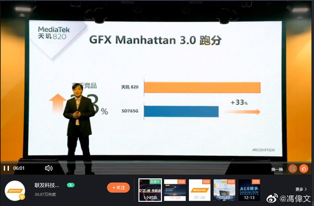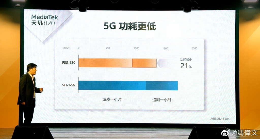 GSMArena on löytänyt myös kuvia MediaTekin julkaisutilaisuudesta, jossa järjestelmäpiiriä verrattiin Qualcommin Snapdragon 765G -piiriin uudemman 768G:n sijasta. Diojen mukaan Dimensity 820 peittoaa Qualcommin sirun GeekBench 4.2:ssa 7 – 37 %:n erolla, GFXBenchin Manhattan 3.0:ssa 33 %:n erolla ja tuntemattomaksi jääneessä tekoälytestissä jopa 300 %:n erolla. Lisäksi järjestelmäpiirin tehonkulutuksen kerrotaan olevan 5G-yhteyksillä 21 % matalampi.