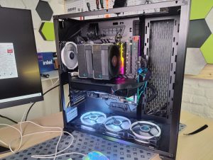 Jälkimmäinen testi toteutettiin kokonaan toisella kokoonpanolla Lian-Lin O11 Dynamic XL -kotelossa eri tuuletinkonfiguraatiolla, jossa kolme 120 mm:n tuuletinta puhaltaa ilmaa alhaalta kotelon sisään. (Testien aikana lasikylki oli kiinni).