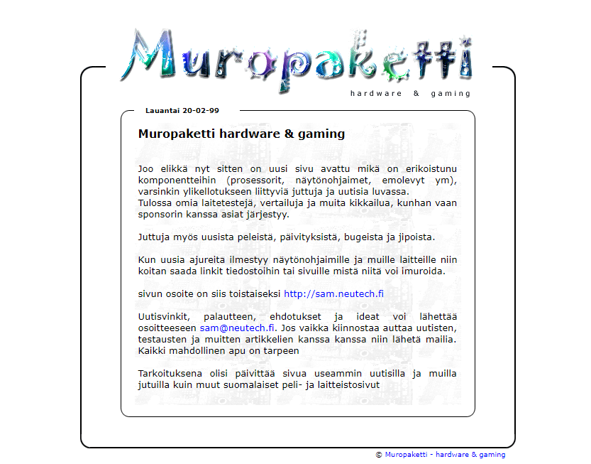 Muropakettia tuli lueskeltua 20 vuotta sitten. Vanhoista uutisista sopivasti löytyy ekan itse kasaamani koneen osat. Matrox G400 max näytönohjain ja AMD K7 700MHz prosessori, eli amd Athlon Slot A. Ihan hyvä ja toimiva kone siitä tulikin.