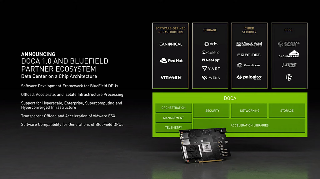 NVIDIAn uusi DOCA 1.0 on ekosysteemi yhtiön BlueField DPU-verkkoprosessoreiden (Data Processing Unit) tueksi. DPU:t ovat verkkokortteihin sijoitettavia prosessoreita, jotka hoitavat datakeskuksen infrastruktuurin pyöritystä. Esimerkiksi koko VMware ESX -virtualisointialustaa voidaan pyörittää ja kiihdyttää suoraan DPU-prosessoreilla. Yhtiön näkemyksen mukaan BlueField-sarjan DPU:t tulevat tulevaisuudessa pyörittämään tekoälyn luomaa ja tekoälyä hyödyntävää koodia.